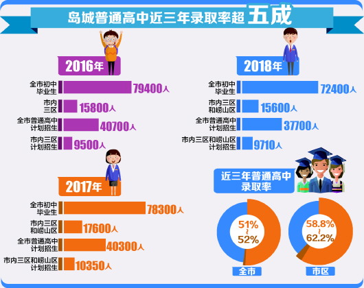 2017年,全市初中毕业生78300人,其中市内三区和崂山区(以下简称”四区”)毕业生17600人;全市普通高中计划招生40300人,其中四区普通高中计划招生10350人。