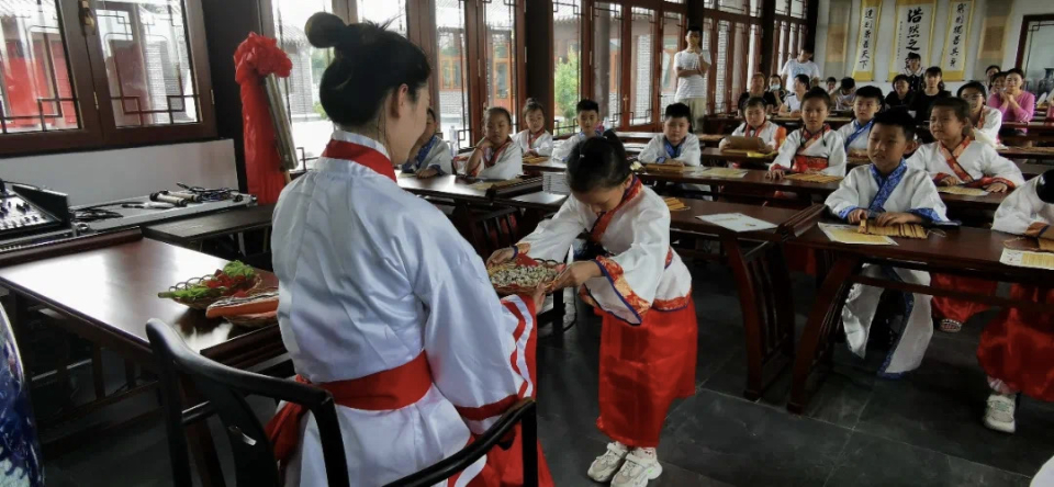 尊师重道,乃久远传统, 回顾古人入学之礼,目的是在于让每位学生,在学习生活中,去尊重知识、尊敬师长,饮水思源,心怀感恩。孩子们习儒家六艺,着汉服,行拜师礼,了解儒家文化,学习儒家思想。以国学教育为背景,以实践课堂为依托,通过丰富多彩的国学实践活动浸润着安静、稳重、知书达理的品格。