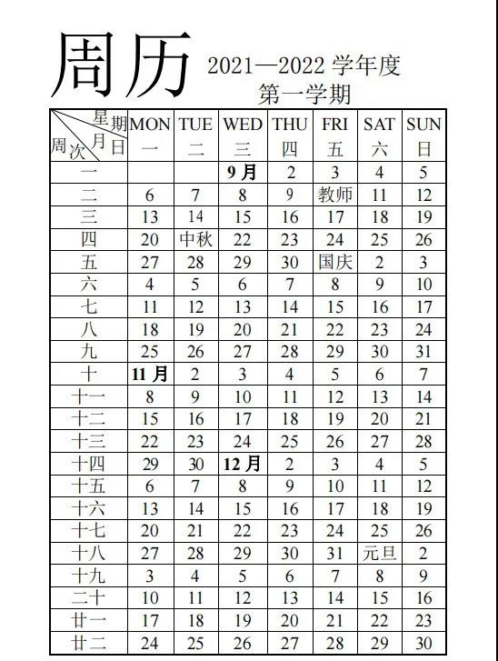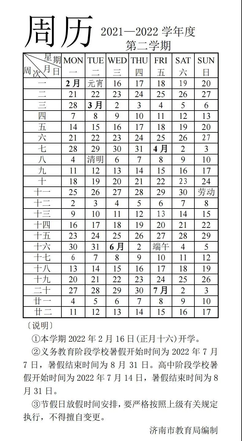 济南市教育局最新发布中小学2021-2022学年周历,第一学期2021年9月1日开学,2022年1月20日开始放寒假!